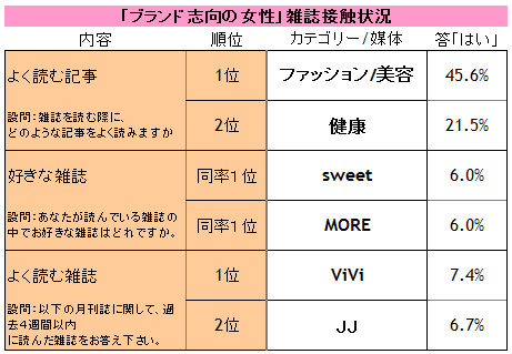 「ブランド志向の女性」が、“好きな雑誌”はsweetとMOREが同率ナンバーワン、“よく読む雑誌”は1位にViVi、2位にJJがランクインしました。